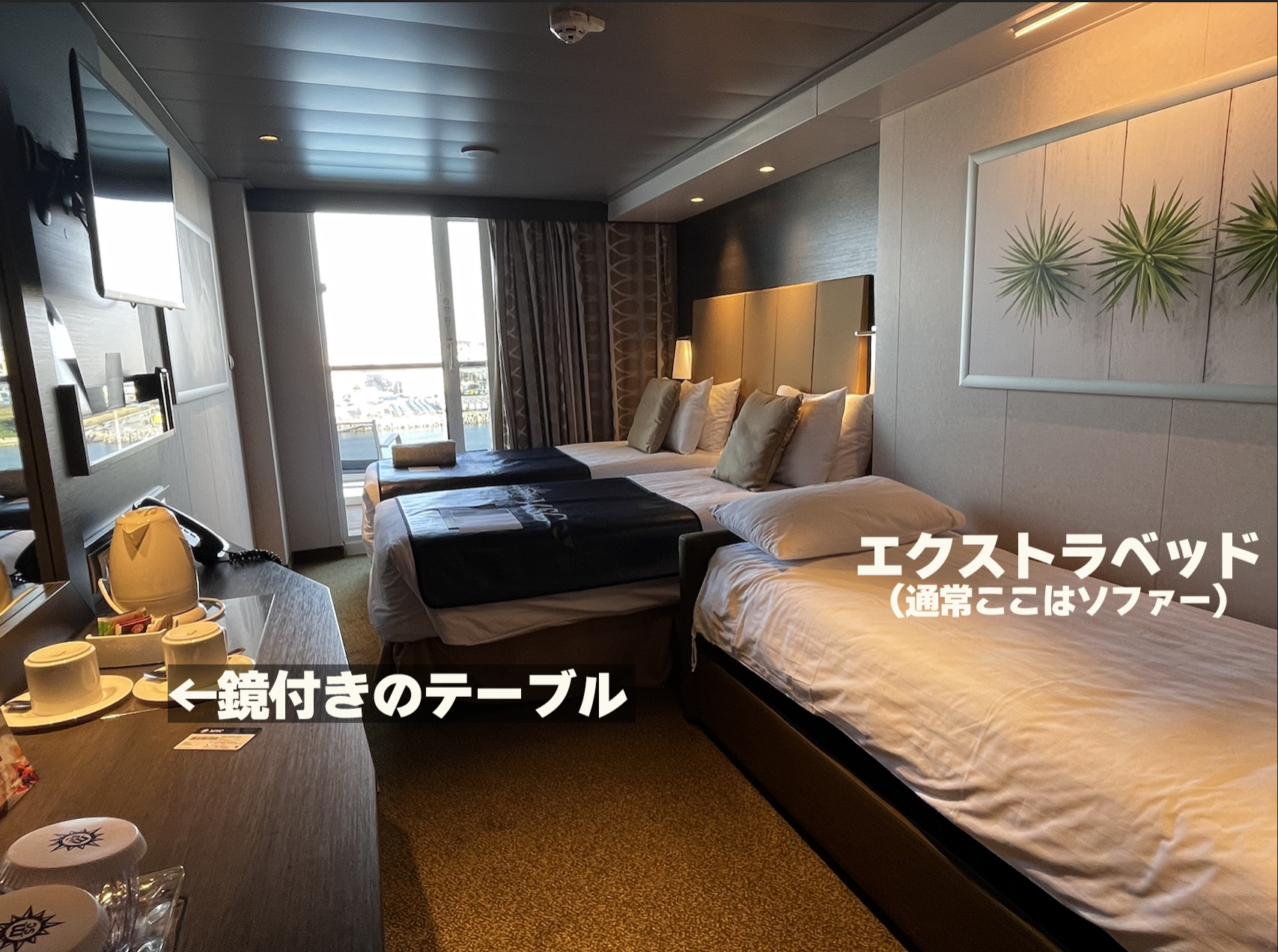 今回は通常ソファーが置いてあるところにエクストラベッドを置いてもらい、ベッドが3つになりました。