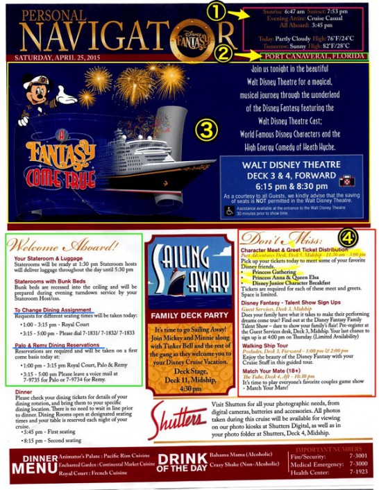 港でやることは「キャラグリ」だけではありません。子どものアクティビティ登録エリア近くにその日の「船内新聞」が置いてあります。船内新聞は客室内にも置かれていますが、乗船してすぐに行動しないと間に合わない可能性があるイベントも有ります。乗船... -