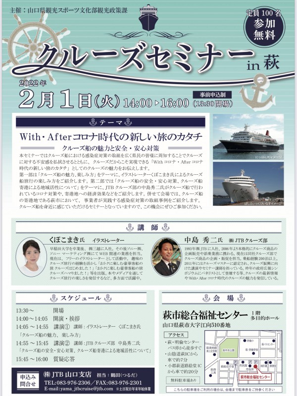 新型コロナウィルス感染状況を鑑み、2022年2月1日(火)に予定されておりましたクルーズセミナーin萩は日程を延期することとなりました。