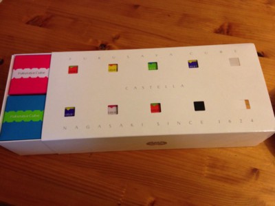 カステラというと、長方形の1本が箱のなかに収まっている・・・という印象がありますが、キューブ状になっているのは気が利いてるなと思いました。