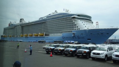 背後にまるでビルのように鎮座しているのがHarmony of the seas 号。とにかく巨大です!!