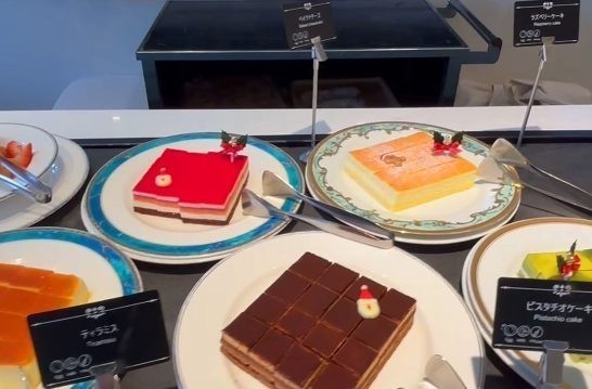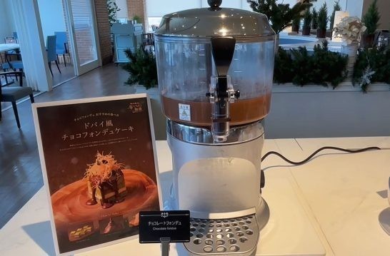 デザートコーナーからケーキを選んで自分でチョコレートフォンデュソースをかけられますが、ドバイ風なのでピスタチオケーキを選ぶのがベスト。カダイフをトッピングすればザクザクドバイ風ケーキの完成!