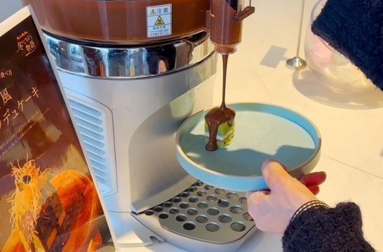 チョコフォンデュソースをかける時、お皿の端にケーキを置かないとソースがケーキの上にかかりません!